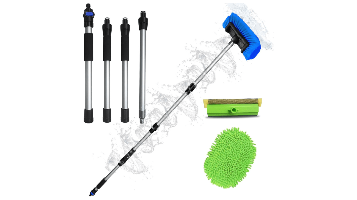 - What’s in the box: 11" soft no-scratch brush head, 4 aluminum poles (custom lengths up to ~68"), water control switch with adapter, reinforced connectors, chenille mop head, and window squeegee.